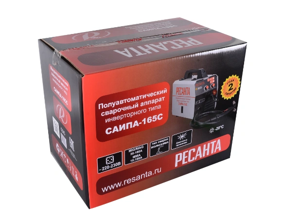 Полуавтоматический сварочный аппарат Ресанта 165С серии САИПА – многофункциональный инверторный источник питания постоянного тока, предназначенный для ручной электродуговой сварки покрытым электродом (метод ММА), а также проволокой в инертной или активной газовой среде (MIG MAG сварка).
