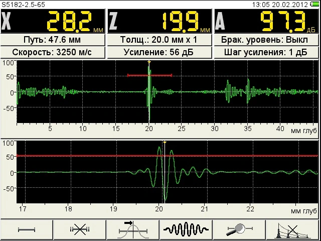 Отображение сигнала и его характеристик в верхней части экрана в режиме НАСТРОЙКА, позволяет оперативно подстраивать параметры контроля. |