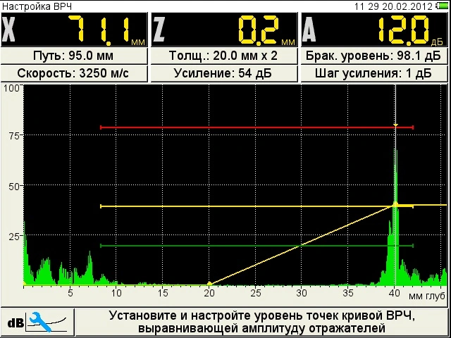 Полуавтоматическая процедура корректировки угла ввода и задержки в призме наклонного преобразователя вследствие его износа. |