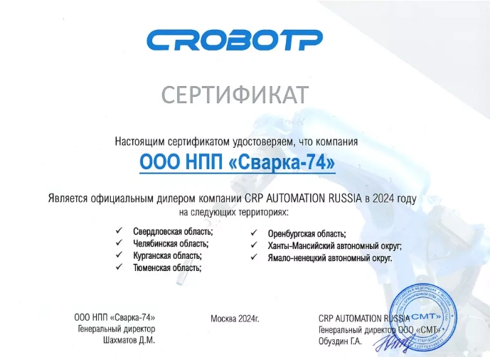 В июне этого года между ООО НПП «Сварка-74» и CRP AUTOMATION RUSSIA было подписано соглашение об открытии представительства завода промышленных роботов CRP в Челябинске. Название CRP Урал. На базе филиала планируется открытие Центра промышленной робототехники. В нем будут обучать специалистов для предприятий различных отраслей нашего региона.