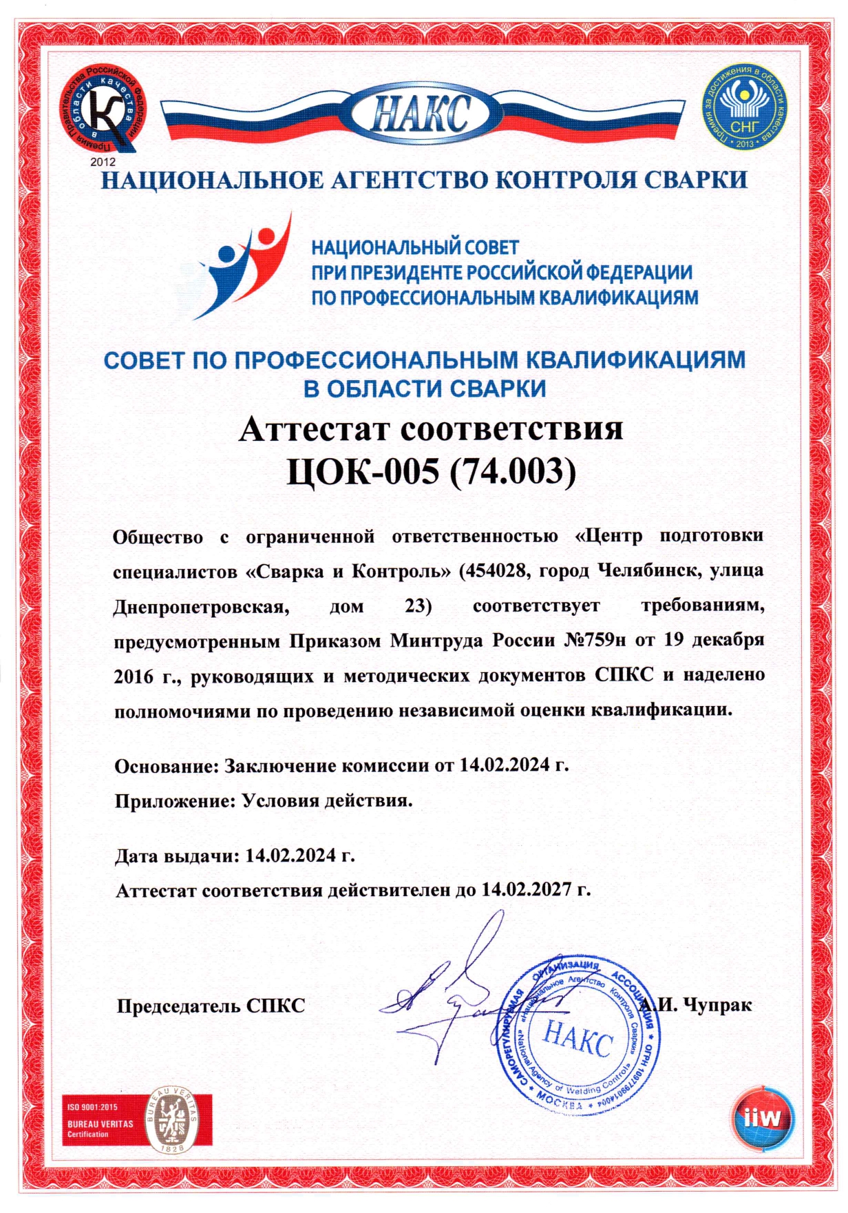 Ее проводит центр оценки квалификаций (юридические лица) в форме профессионального экзамена (п. 8 ст. 2 Закона № 238-ФЗ). Наш центр оценки квалификации имеет Аттестат соответствия ЦОК-005 № 74.003 (ООО "Центр подготовки специалистов "Сварка и Контроль")